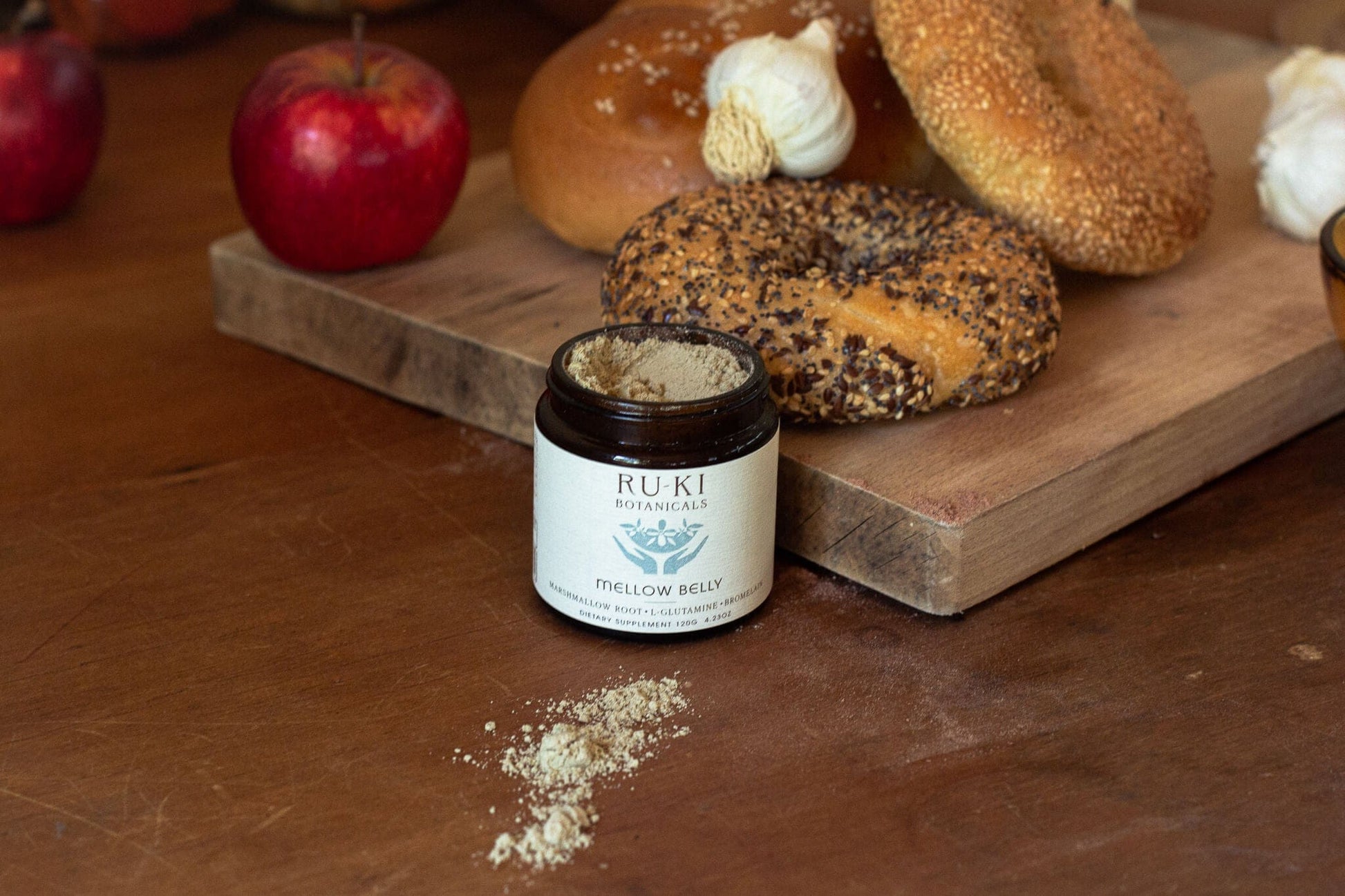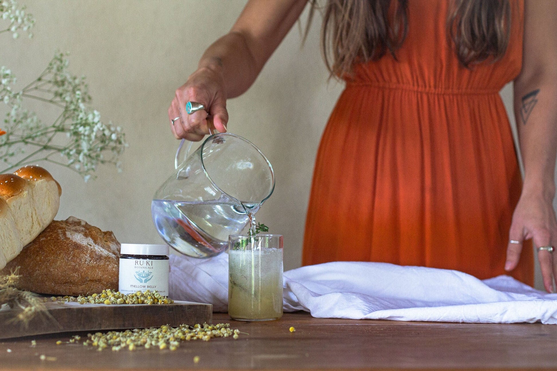 Pear & thyme mocktail: Cut a thin slice of pear and place in a glass with ice along with 1 tsp of Mellow Belly powder. Fill to the top with soda water and add a spring of thyme for a refreshing gut elixir.